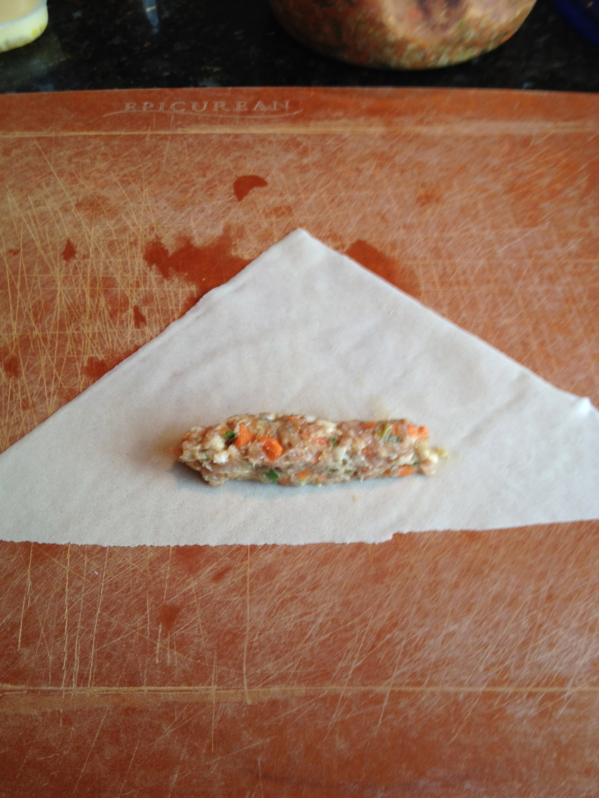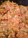 ground pork, chopped carrots and onions in a large bowl. Put the garlic cloves, sliced ginger, and green onions in a food processor. Pulse them until they are very finely chopped. Add them to the bowl. Add the soy sauce and fish sauce to the bowl and then combine all the ingredients very well. Set in the fridge to cure for at least 6 hours but preferably overnight – after several hours I always (ALWAYS) take a small spoonful of mixture and form it into a patty and fry it in a sauté pan. I do this so I can taste the mixture. If it needs more seasoning I would add another 1/8 cup of soy sauce if needed).